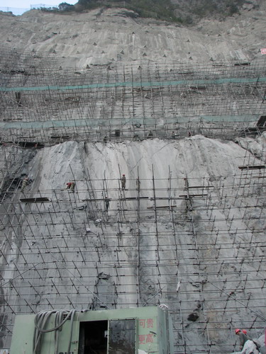 開采后的懸壁要處理,即在巖石中打進鋼筋,再上噴混凝土