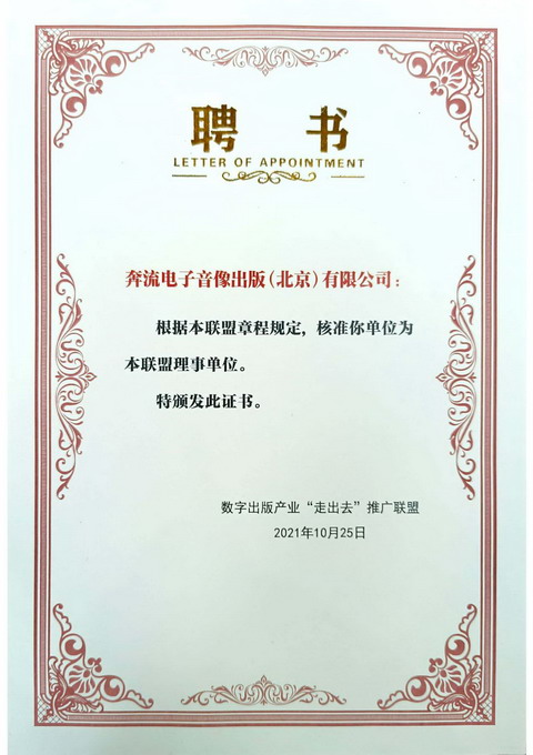 近日,數(shù)字出版產(chǎn)業(yè)“走出去”推廣聯(lián)盟在京正式成立,聯(lián)盟選出10家理事長單位、29家理事單位。奔流電子音像出版(北京)有限公司當(dāng)選第一屆理事單位,公司常務(wù)副總經(jīng)理沈林莉當(dāng)選聯(lián)盟秘書處副秘書長。