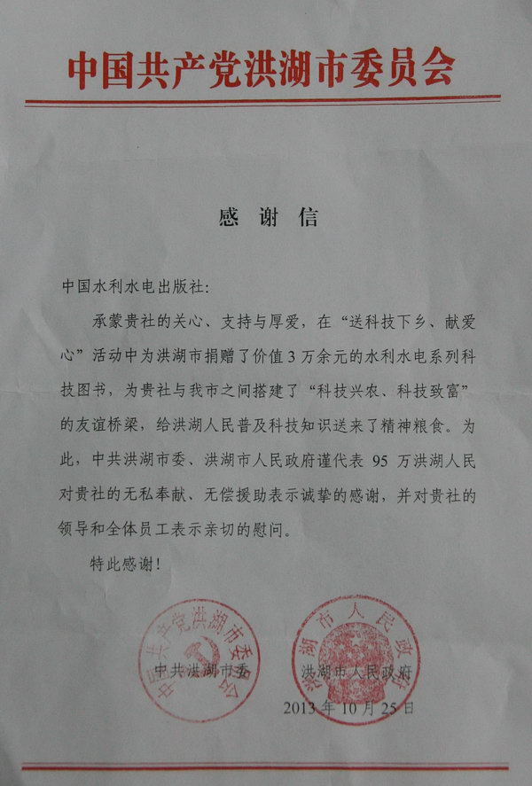 “洪湖水,浪打浪,洪湖岸邊是家鄉(xiāng)”,洪湖市因境內(nèi)53萬畝的同名湖泊而得名,一曲《洪湖水》,更使洪湖這一江漢明珠和魚米水鄉(xiāng)聲播遐邇,四海聞名。近期,我社水利水電出版分社編輯在與湖北省洪湖市有關(guān)部門商洽水利志書出版工作中,了解到該市正在開展“送科技下鄉(xiāng)、獻愛心”活動,經(jīng)社領(lǐng)導(dǎo)同意,我社向洪湖市捐贈了價值3萬余元的水利水電科技圖書。10月25日,洪湖市委、市政府專門致信我社表示誠摯感謝。