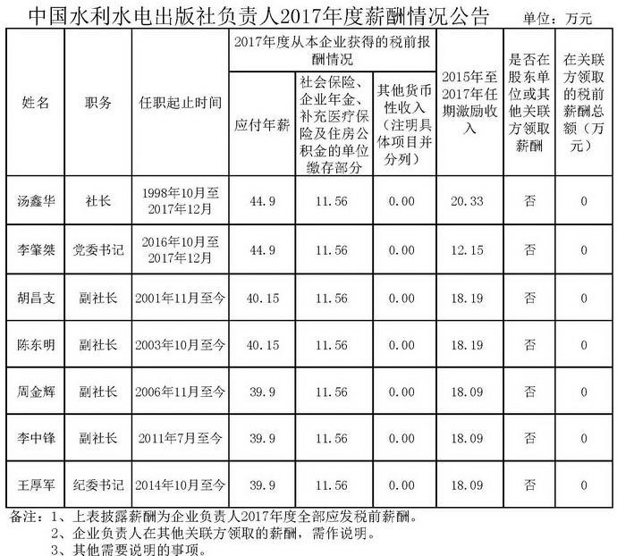 水電知識(shí)網(wǎng)»資訊»出版?zhèn)髅劫Y訊»中國(guó)水利水電出版社負(fù)責(zé)人2017年度薪酬情況公告