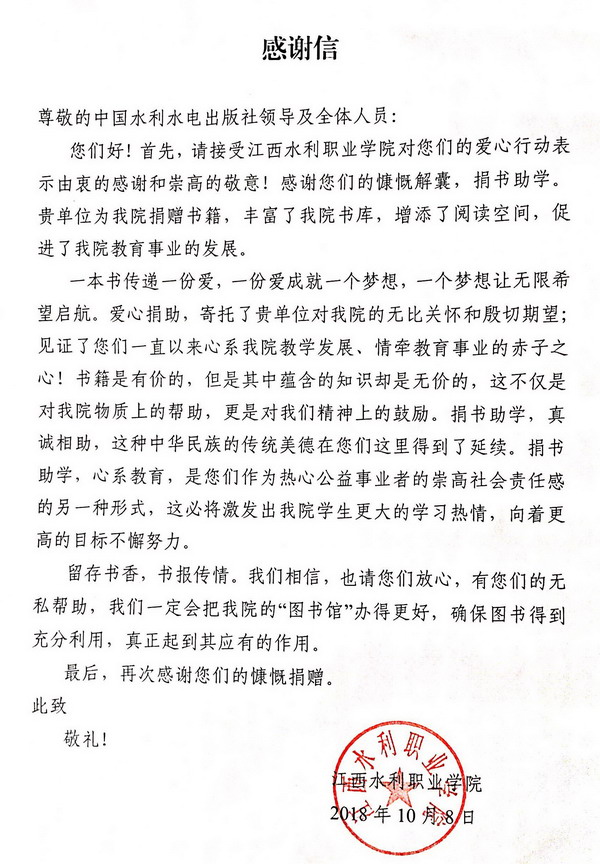 水電知識網»資訊»出版傳媒資訊»江西水利職業學院致我社感謝信